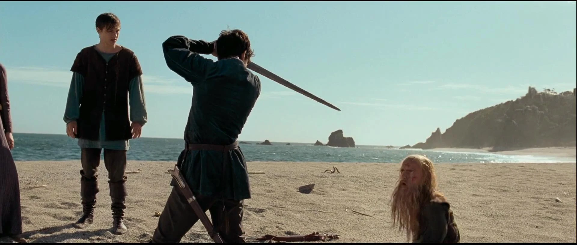 Après avoir récupéré leurs effets personnels et armes entre autres, les quatre enfants aperçoivent au loin une petite barque dans laquelle deux Telmarins détiennent un nain. Susan parvient à éliminer les Telmarins avec son arc et ses flèches. Quant à Peter et Edmund (Susan dans la version littéraire car Edmund ne sait pas encore très bien nagé), ces derniers plongent pour sauver le nain et pour récupérer la barque.