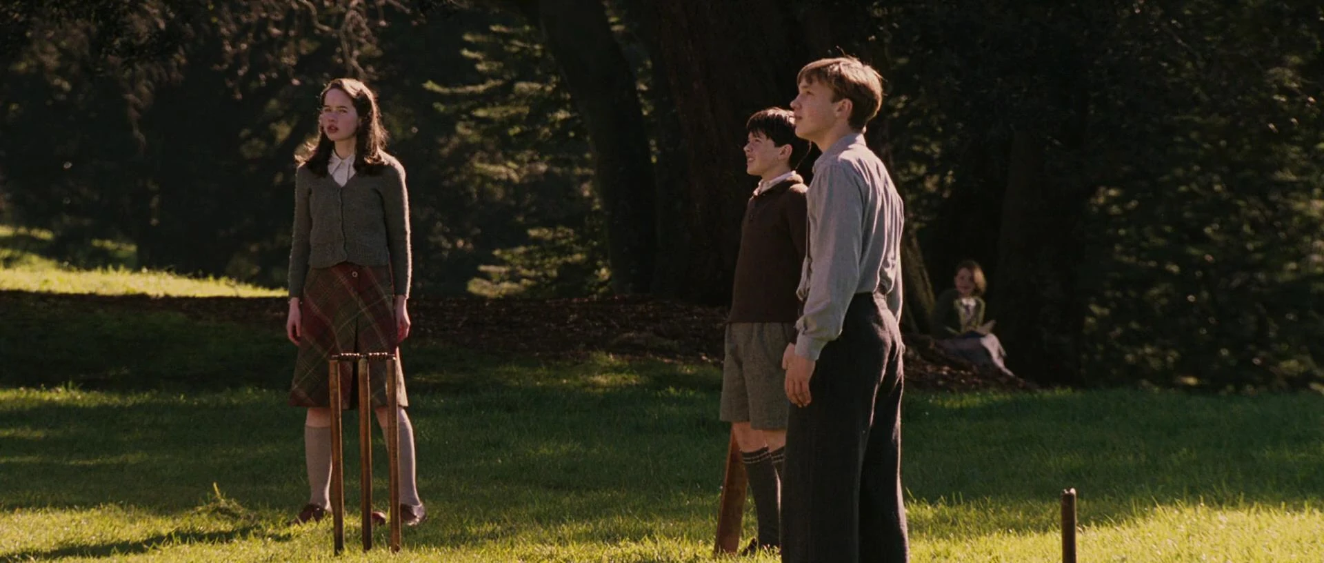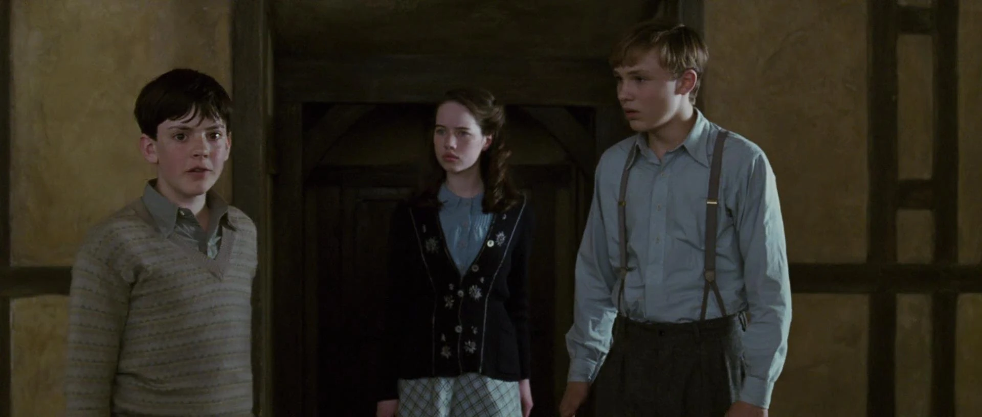 Préoccupé par les propos de la sorcière, Edmund tente de convaincre ses sœurs et son frère de jouer à cache-cache, encore une fois, mais en vain. Par la suite, Edmund casse accidentellement le carreau d’une vitre, après avoir mal réceptionné la balle de baseball. Pour échapper à la gouvernante et pour éviter de se faire gronder, les enfants Pevensie se cachent dans l’armoire : Peter et Susan découvrent à leur tour le monde de Narnia.
