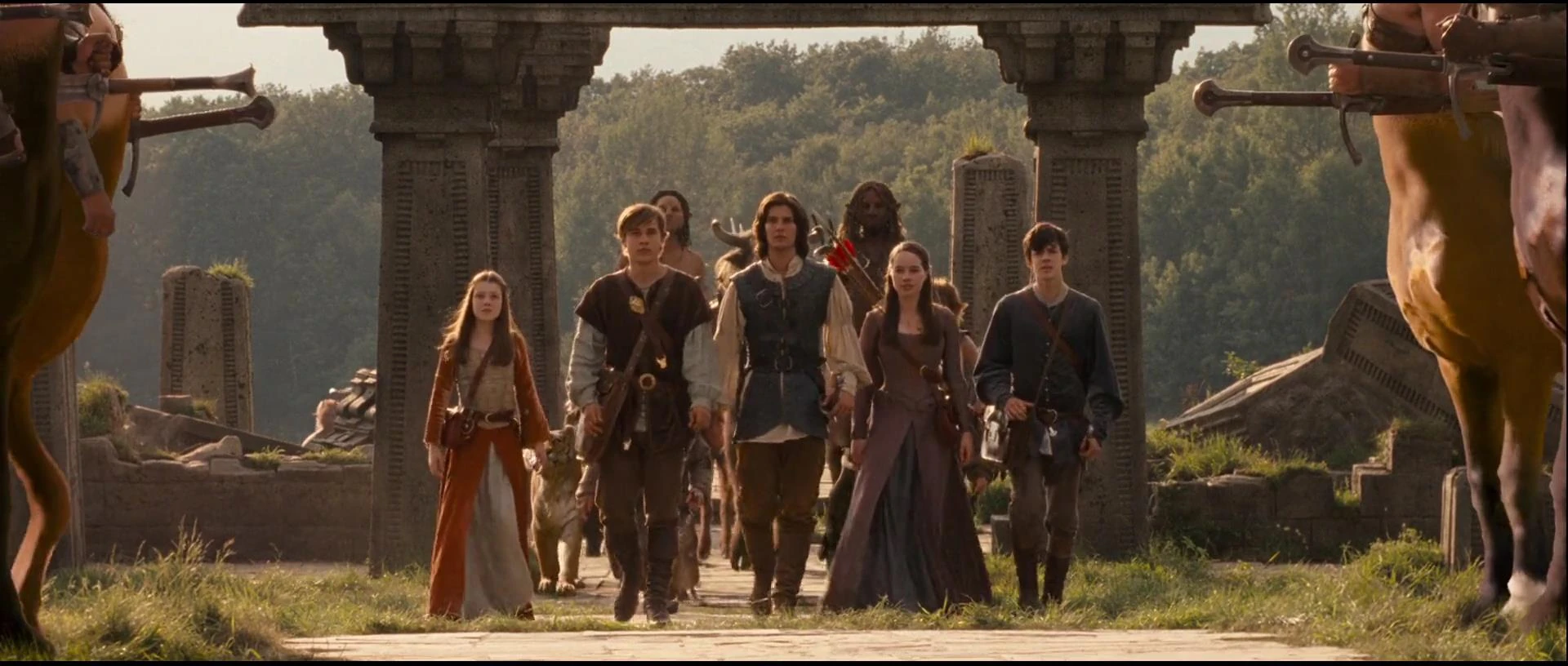 Par la suite, les Pevensie doivent retourner dans leur monde mais c'est avec tristesse et stupeur qu'Edmund et Lucy apprennent que leurs deux aînés ne pourront plus revenir à Narnia. Après une série d'embrassades, les quatre enfants traversent le portails et atterissent dans la gare, sur le chemin de l'école. La fratrie prend le train pour rejoindre leur école respectif mais Edmund constate avoir oublié sa lampe torche à Narnia.