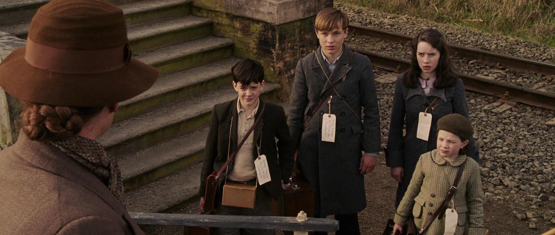 Au beau milieu de la nuit, les Pevensie sont réveillés par les raids aériens allemands. Pour se protéger, ils se réfugient dans leur abri anti-bombe de type Anderson- un abri implanté le jardin. Avant de partir, Edmund se précipite à l'intérieur de la maison pour récupérer une photo de son père, parti au front. Le lendemain matin, les quatre enfants Pevensie, accompagnés de leur mère, embarquent à bord d'un train pour la campagne.