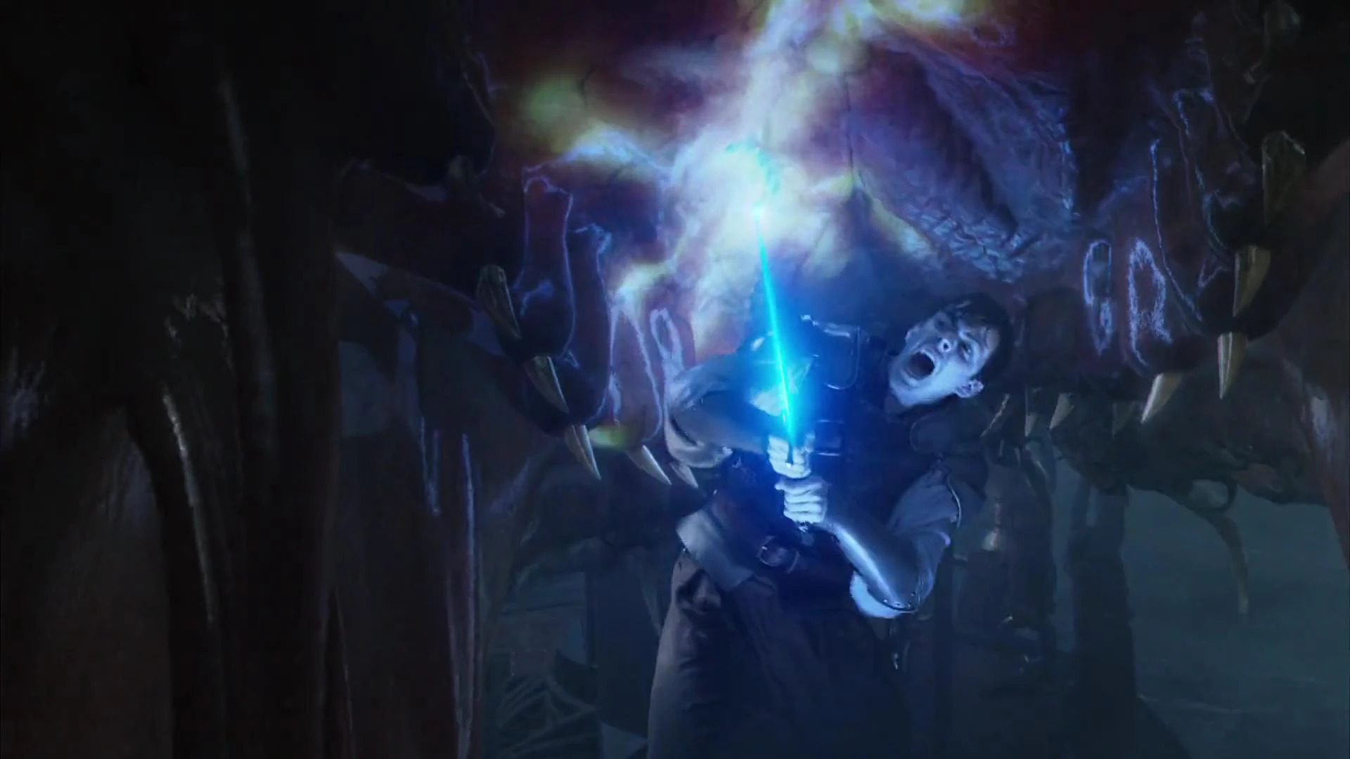 La créature surgit et attaque le bateau. Pour l’éliminer, le jeune roi tente de faire diversion en se postant à l’avant du bateau avec sa lampe torche, avant de faire une violente chute. À la fin, Edmund parvient à tuer le monstre, grâce à l’épée de Peter et a l’intervention d’Eustache, qui a reussi à rassembler toutes les épées des sept seigneurs de Telmar sur la table d’Aslan. En empalant le serpent, le jeune homme annule les pouvoirs de la brume verte : les victimes reviennent sains et saufs.