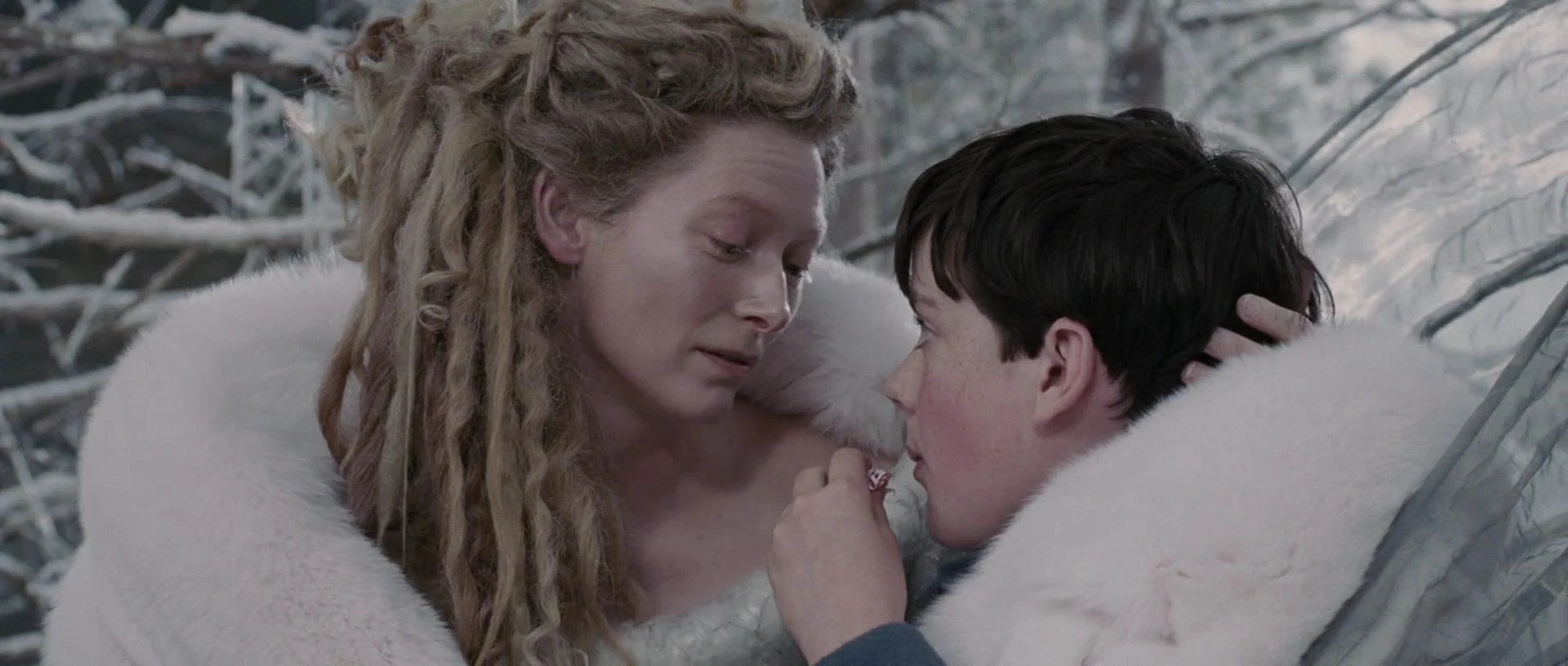 À son arrivée chez la Sorcière, Edmund est capturé. Dans l’optique de maintenir son prisonnier en vie, la souveraine sert au petit garçon du pain sec immangeable ainsi que de l’eau glacée. Poursuivant les trois autres enfants Pevensie, la Sorcière monte à bord de son traîneau et emmène Edmund avec elle. Durant le périple, Edmund souffre profondément du froid : le pauvre petit garçon ne sent plus ses membres. Sur leur chemin, ils croisent un renard ainsi que des écureuils célébrant la venue du Père Noël. Mécontente, la Sorcière les transforme en statue de pierre, malgré l’intervention d’Edmund.