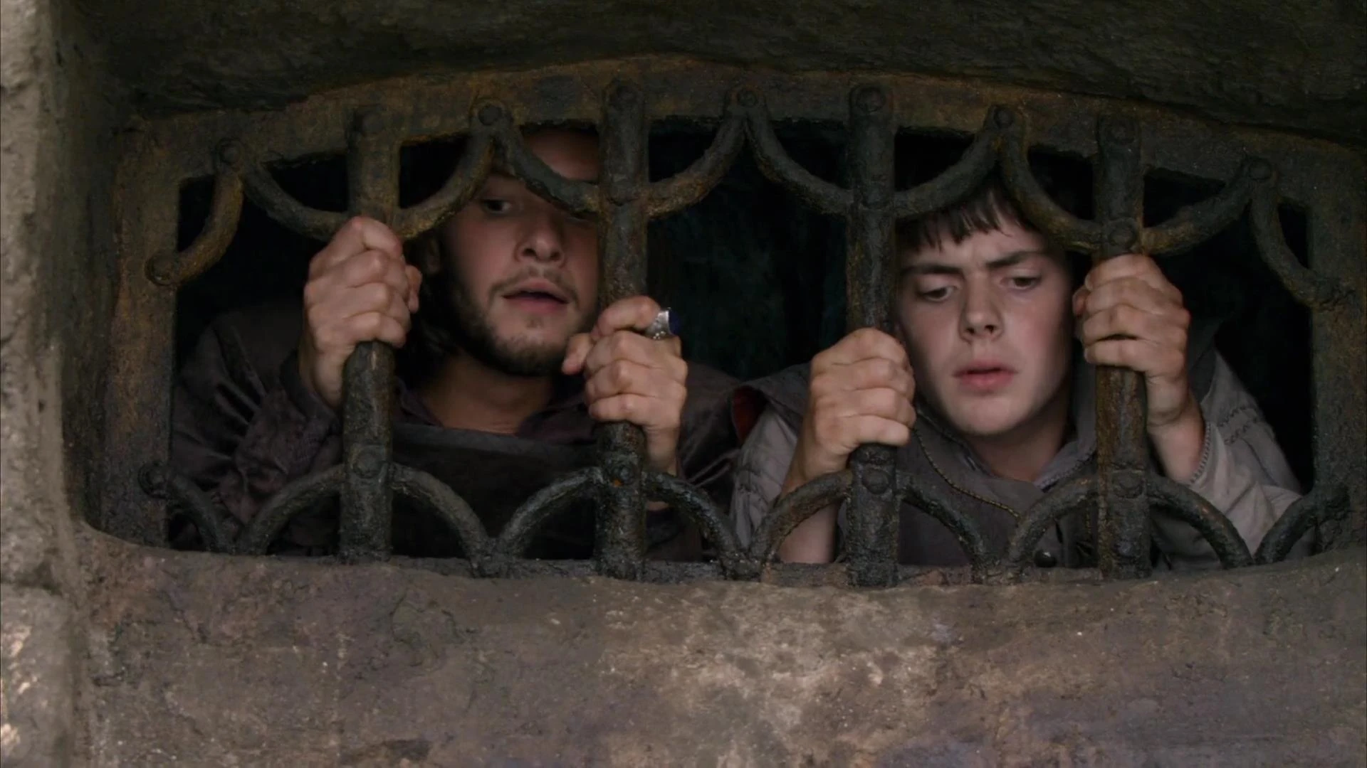 Dans les cachots, les deux jeunes rois font la rencontre du seigneur Bern. De plus, depuis leur cellule, ils aperçoivent au loin un groupe de personnes disparaître à travers une étrange brume verte. Ensemble, ils réussissent à s'échapper et, grâce à l'équipage narnienne, ils parviennent à libérer Lucy et Eustache. À la fin, le Seigneur Bern leur confie une des septs épées des seigneurs de Telmar.