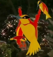 В сериале птицы изображены с помощью мультипликации. Это маленькие красные с жёлтым птички, похожие на колибри. Не показано, как они поднимают и уносят остатки еды - птицы просто порхают над столом, и блюда и подносы становятся пустыми сами собой. После этого птицы улетают.