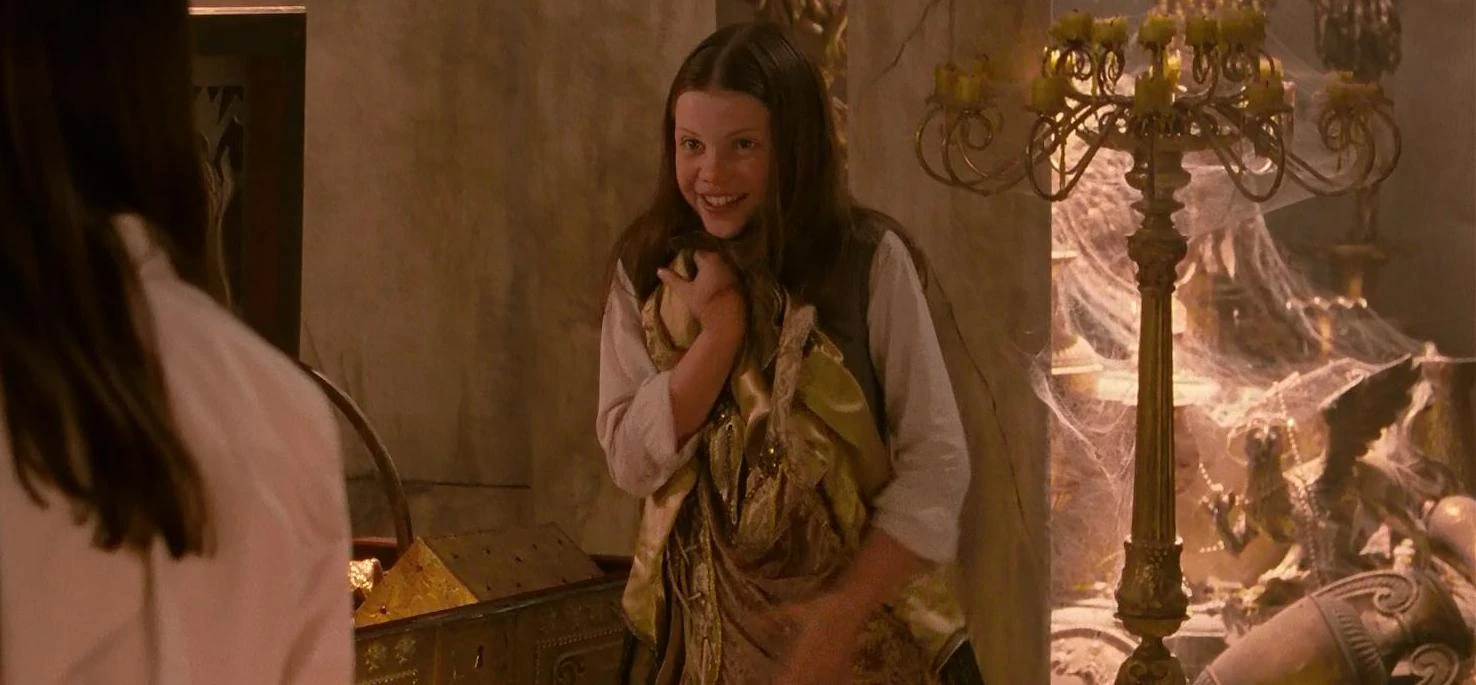 Люси сразу заявила, что здесь ей как-то не по себе, но отправилась вместе со Сьюзан собирать яблоки, пока мальчики разжигали костёр. Скромный ужин закончился неожиданной находкой. Сьюзан обнаружила возле колодца шахматную фигурку, которая была один в один такая же, как у них, когда они были королями и королевами. Люси согласилась с доводами Питера, что они действительно находятся на развалинах Кэр-Паравела, и вспомнила о королевской сокровищнице. Питер и Эдмунд быстро разыскали вход туда и выломали подгнившую деревянную дверь. Дети спустились вниз и как будто вернулись в прошлое: все их сокровища лежали на своём месте. Люси взяла с собой лечебный напиток.