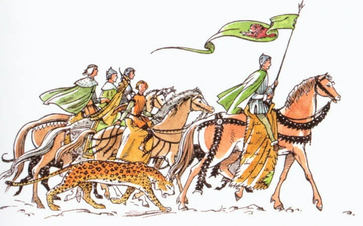 By mid-morning, the Narnian relief column arrived over the pass and fell on Rabadash's rear. The cats attacked on the left flank, targeting the horses of the men who had dismounted to wield the battering ram before turning on the men. However, Rabadash reformed a line of about one hundred cavalry and charged the Narnian line. By leaving the gate, he exposed his rear to attack from the castle. Lune and the Archenlander mounted knights rode out from Anvard. Meanwhile, the giants fell on Rabadash's right flank as the cats closed in on his left. Hemmed in, Rabadash had no chance. Within minutes the entire force was either killed or had surrendered. At one point a Giant wearing spiked boots tries to stomp Rabadash to death, but mostly misses and tears the back of of his chain mail hauberk as easily as a man might tear a shirt. Rabadash climbs up on something to gain a height advantage but realizing that being above the rest of the combatants made him a target for the Narnian archers jumps off. Forced to jump sideways as there was no clear space to land in front of him, the tear in his hauberk catches on a hook that once had a ring for tethering a horse. Thus he is left hanging from his badly pulled up hauberk like a bit of washing hung to dry and a laughingstock.