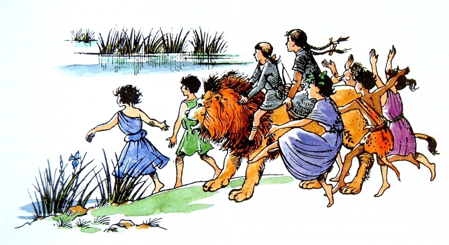 Aslan, Lucy, Susan, Bacchus, and the maenads go down to the Ford of Beruna.