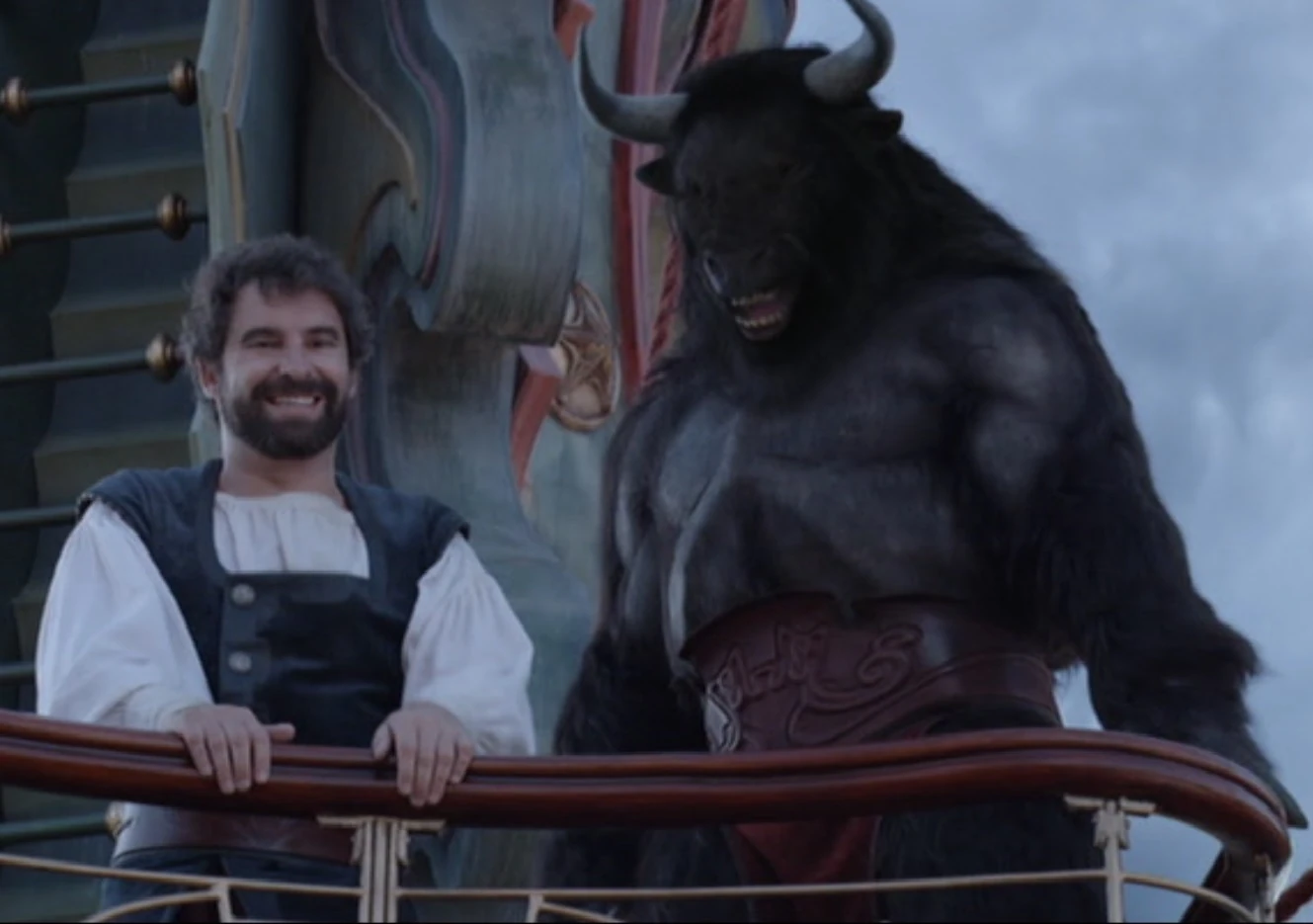 Tavros was a large Minotaur, powerfully built, with brown fur so dark that it was almost black. He only carried a weapon (a battle-axe or a Kopesh sword) whenever he went ashore, but never on board the ship. His only type of clothing was a red loincloth with a large red belt. His description is exactly the same as Jemain.